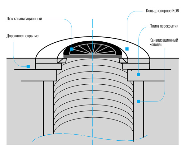 Poznámka: Těleso poklopu se instaluje na betonovou nebo železobetonovou konstrukci, jejíž technické požadavky jsou stanoveny platnou normou GOST 8020-90 „Betonové a železobetonové konstrukce pro kanalizační, vodovodní a plynovodní sítě“. Hlavním účelem opěrného kruhu je přerozdělení specifického zatížení za účelem ochrany základové desky před destrukcí. Jak je znázorněno na obrázcích, studna je zakryta základovou deskou, na které je namontován opěrný prstenec. Těleso poklopu je instalováno na opěrném prstenci. Poklop poklopu by měl být v jedné rovině s povrchem.